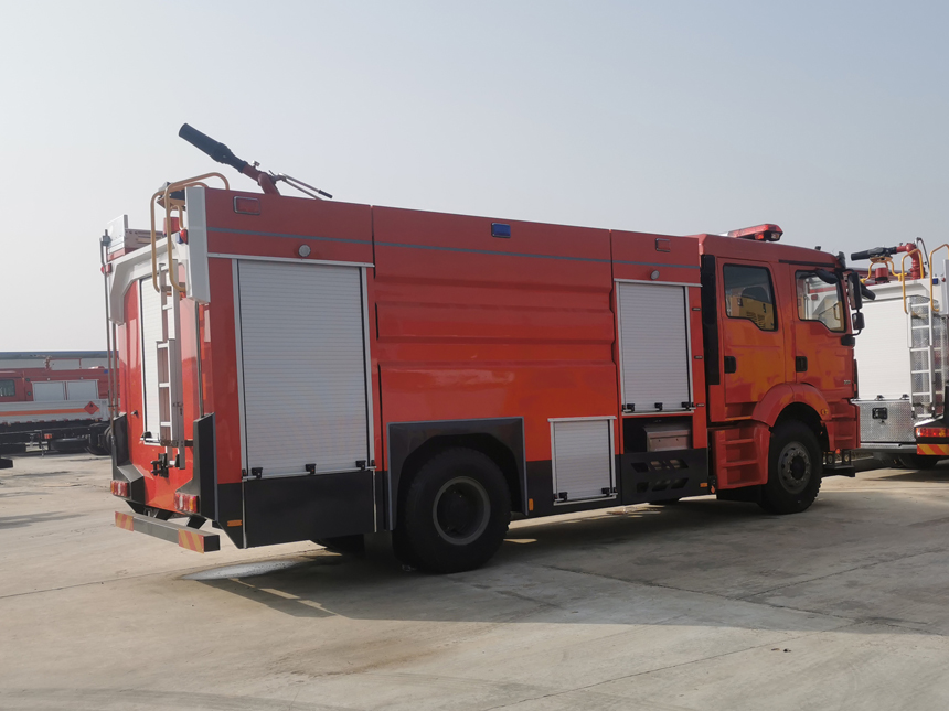 豪沃8噸泡沫消防車采用重汽豪沃ZZ5207TXFV471GF5底盤改裝而成。整車由消防員乘員室和車身兩大部分組成,乘員室為原裝雙排,可乘坐2+4人,該車為外露罐結構,車身前部為器材箱,中部為罐體,后部為泵房。載液罐體為優質碳鋼,內部噴涂環氧底漆及環氧瀝青漆,與底盤采用彈性連接,載水量5600kg,泡沫液量2255kg,裝備了上海茸申消防設備有限公司生產CB20.10/30.60-RS型中低壓消防泵,額定流量60L/S,車頂安裝成都威斯特消防機械有限公司生產的PL8/48型車用消防炮。該車最大的特點是載液量大、操控性好、維修簡便。可廣泛應用于公安消防隊、廠礦企業及社區、碼頭等場所,撲救大型油類火災和一般物質火災。 | |||
