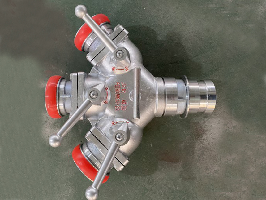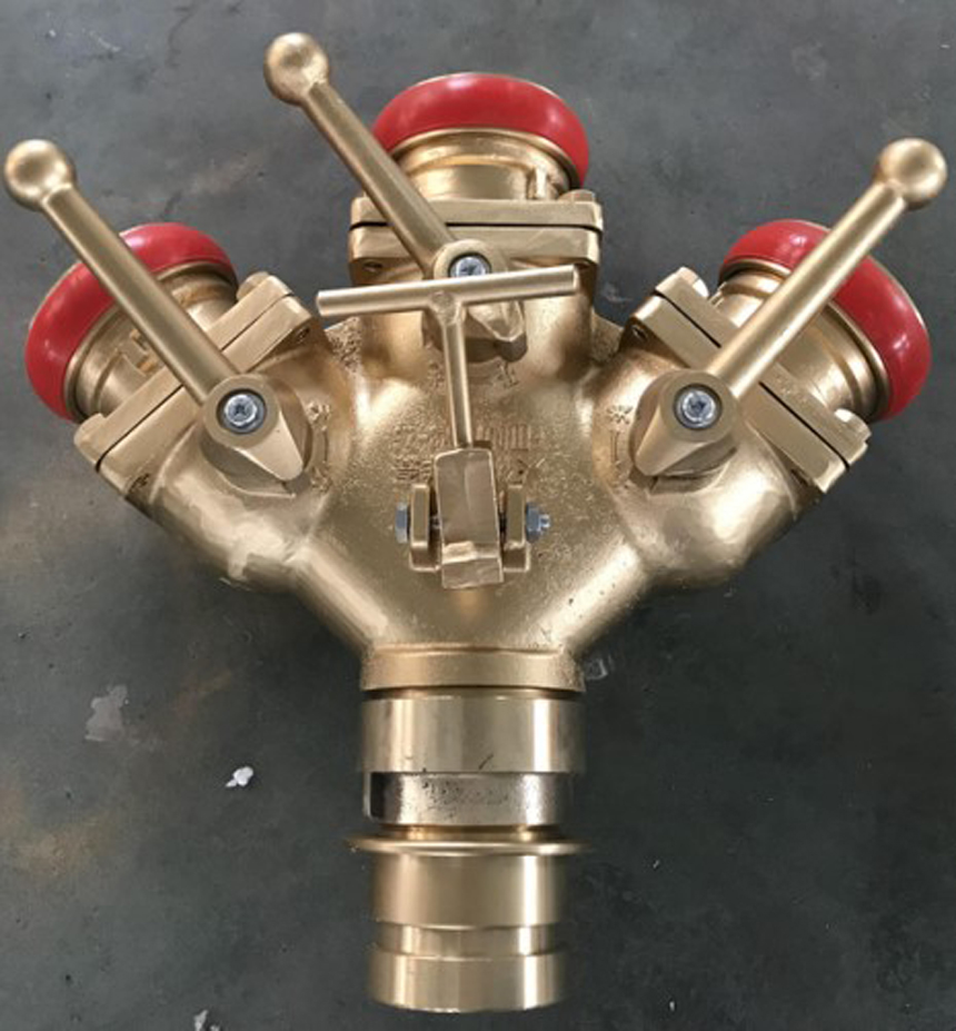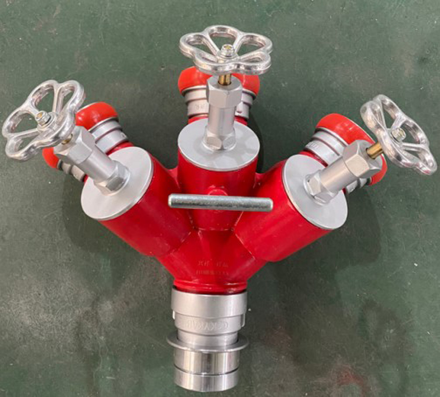 三分水器是從水帶主干線分出水帶分線的器材。采用鋁合金經精加工而成,由主體、閥體、接口組成,每一個分水器有一個進水口和幾個出水口,出水口上均有球閥裝置,可以同時使用,也可以分別使用,便于控制水流水壓,增加和調換支線水帶。